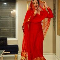 How pretty and carefree she looks in this red suit!!! I am surely going to buy something like this for my upcoming wedding functions!
